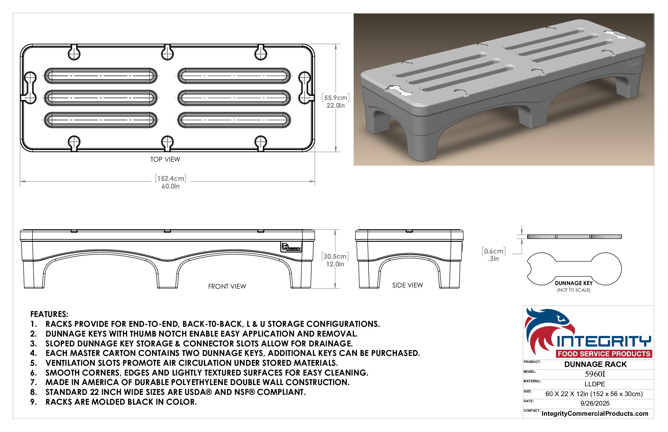 Dunnage Racks with Ventilation Slots to Promote Air Circulation under stored materials. Includes Dunnage Keys allow for End to End, Back to Back, or “L” & “U” shaped Storage Configurations. Dunnage Keys with Thumb Notch Enable Easy Application & Removal. Sloped Dunnage Key Storage & Connector Slots allow for Drainage. Each Master Carton Contains One White (1) Dunnage Key. Additional Keys may be purchased. Hygienic Smooth Surface, Corners & Edges and Lightly Textured Surfaces for Easy Cleaning. Made in America of durable Polyethylene Plastic , Double Wall construction. NSF®, USDA®, FDA® Approved Material for Food Contact. Sometimes called a Freezer Pallet or Refrigeration Platform Skid. food storage in freezers or refrigeration. Also used as a dry goods POS (Point of Sale) display.