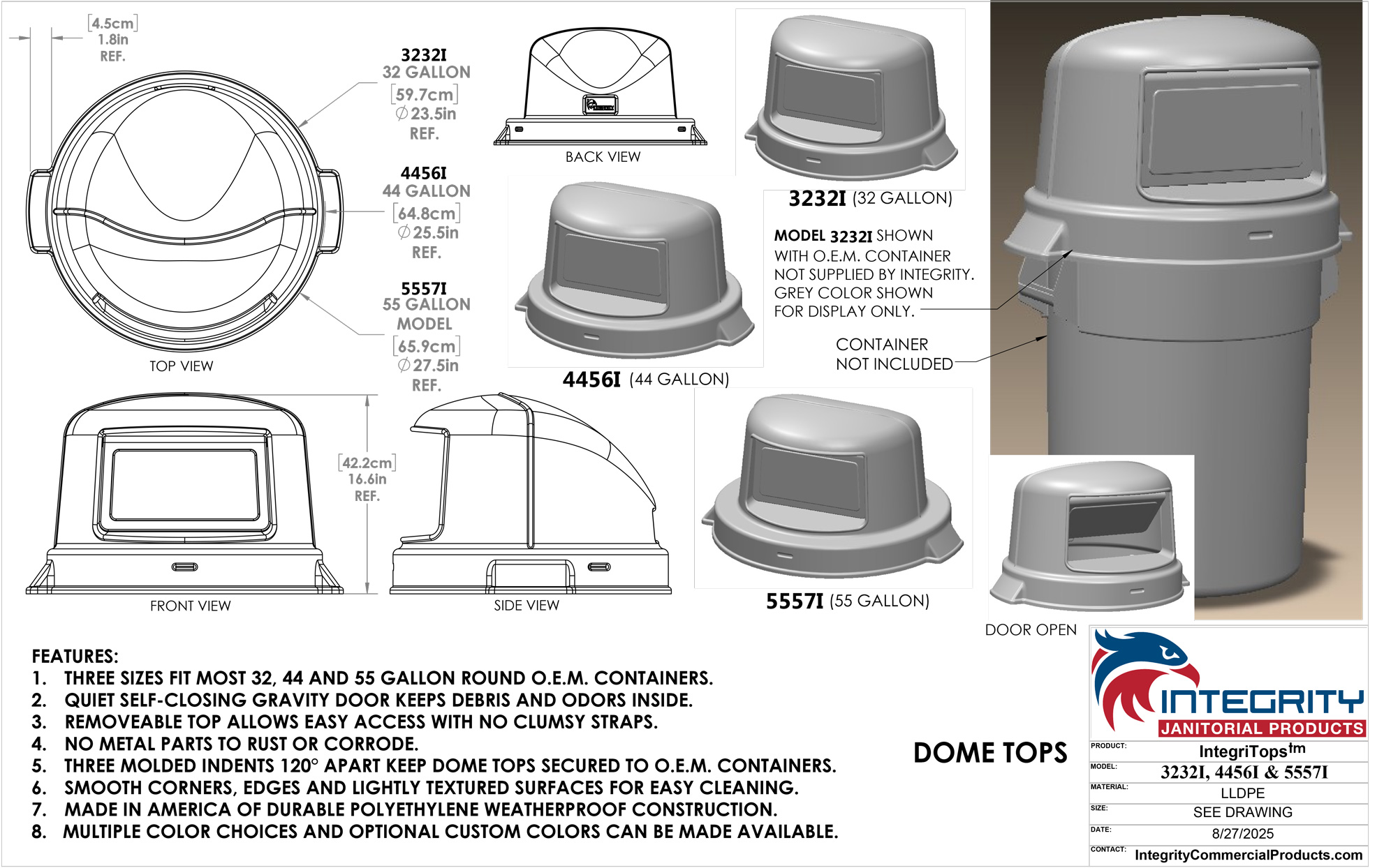 55 gal size top with waste door. This product line of IntegraTops is available in three sizes and is compatible with most 32, 44, and 55-gallon round plasic containers. It features a quiet, self-closing gravity door that effectively contains debris and odors, while the removable top allows for convenient access without cumbersome straps. Designed without any metal components, it resists rust and corrosion. The dome tops are securely fastened to OEM containers by three molded indents spaced 120° apart. With smooth corners, rounded edges, and lightly textured surfaces, cleaning is simple and efficient. The product is produced in the United States using durable, weatherproof polyethylene and is offered in multiple standard colors, with custom color options also available upon request.