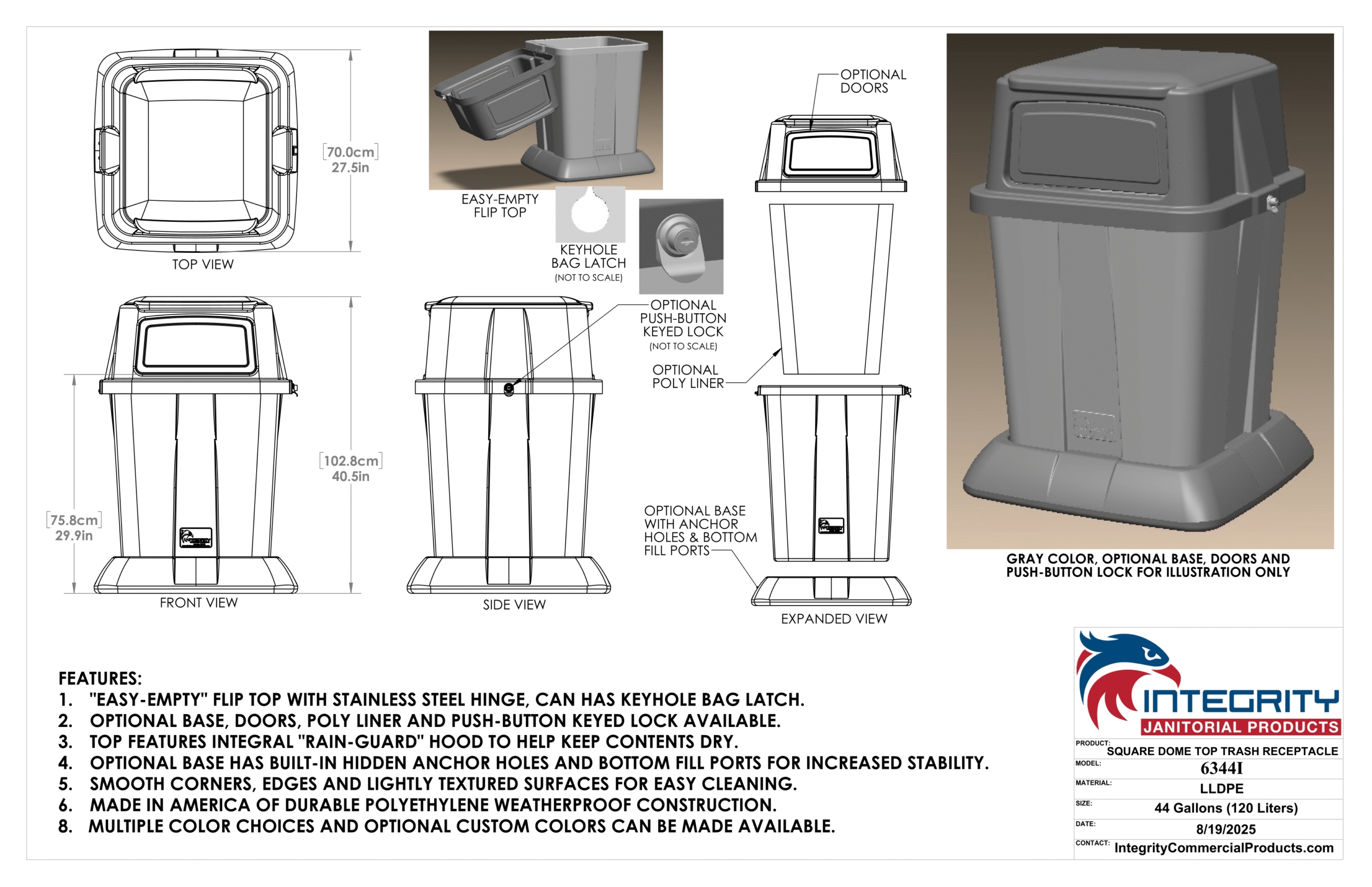 The newest feature rich Integrity Janitorial Products decorative super heavy duty plastic molded waste container. Hinged top for easy filled bag or liner removal, Beautiful faux granite or black color options. OPTIONAL: push-button top closure lock, base for adding weight or attaching to sidewalk, and 2 OPTIONAL gravity closing doors to help seal and protect from fire, odors, insects and vermin. This is a 44 gallon can (55 gallon is also available)