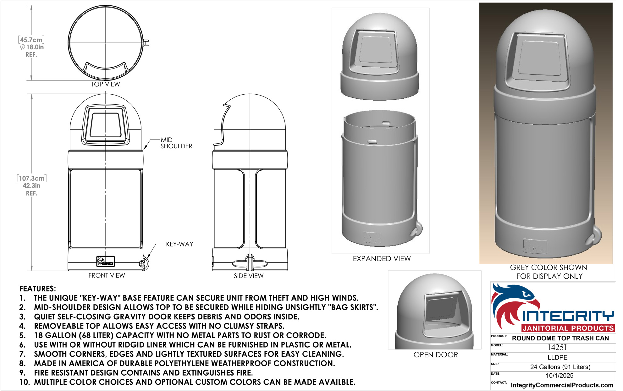 These receptacles have all the great features and are available in four granite finishes or shiny black that provide the architectural appeal of a concrete or stone receptacle without the excessive weight or cost. This model is 24 gallon size. (18 gal is also available) Fire deterrent and weather resistant.