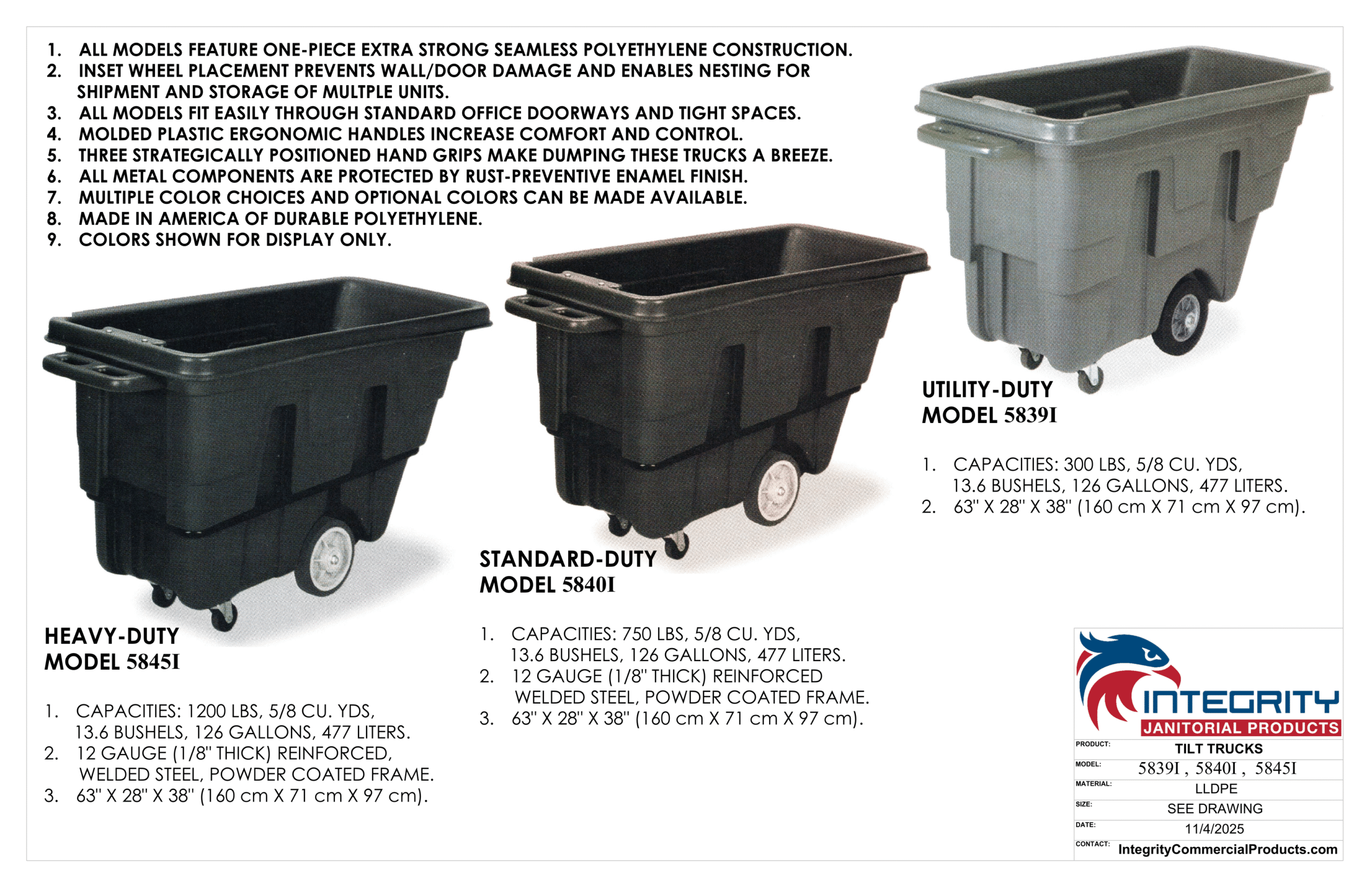Heavy Duty 5/8 Cu. Yards Tilt Truck – 1200 lbs / 544 kg capacity 126 Gallons / 477 liters, 12 gauge (1/8″ thick) powder coated steel frame and molded plastic handle. Commercial Grade Casters and Wheels